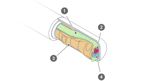 - De filmdrager en de RTD-elementen zijn op een drager bevestigd, om de elementen heel nauwkeurig te kunnen positioneren o zo een constante kracht tegen de binnenste mantelwand te garanderen