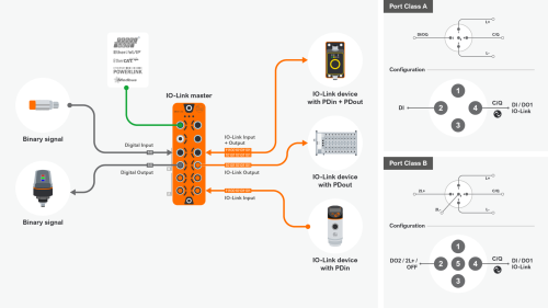 Un maître IO-Link fournit généralement plusieurs ports IO-Link pour connecter des appareils IO-Link. On distingue les ports A et B. Cette norme est standardisée pour tous les fabricants et décrite dans la spécification IO-Link.