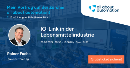 ist seit 2012 in der ifm-Gruppe tätig. Bevor er zu uns kam, hat er über mehrere Jahre Industrieanlagen programmiert und in Betrieb genommen. Rainer Fuchs ist für die Betreuung von Kunden aus der Automation zuständig, bietet darüber hinaus IO-Link-Schulungen an und unterstützt bei allen Fragen rund um IO-Link, auch bei der Integration dieser Technologie in die Automatisierungswelt. Auf der all about automation wird er einen Vortrag zum Thema «IO-Link in Food & Beverage» in der Talk Lounge halten.