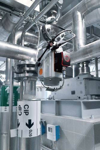 写真3(右):醸造所内の湯と冷水が循環する配管におよそ40台のMVQが設置されています。IO-Linkのデジタル通信とアナログ信号の両方でデータを伝送します。