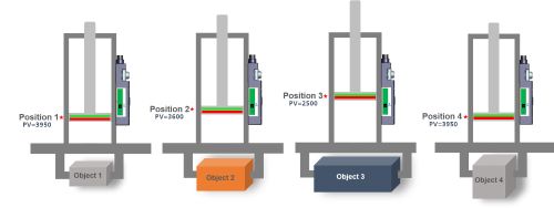 Note the process value (PV) changes in the image below. The process value is a unitless number that is relative to the cylinder stroke position. Of course, if two objects are of identical width (< 10 µ), the sensor cannot differentiate between the objects.