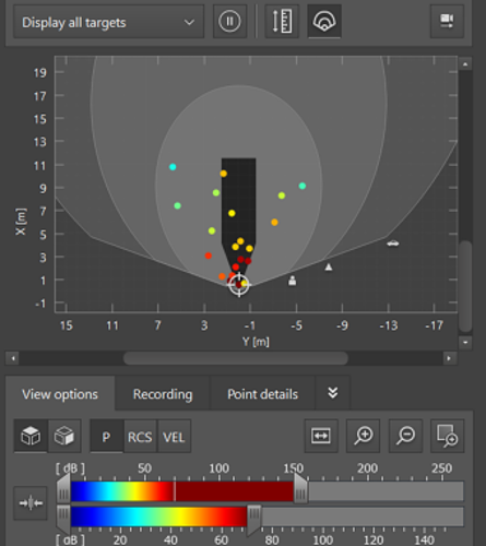 Within the sensor’s FoV (Field of View), the sensor can output a list of detected objects. Each object has parameters such as distance, position, velocity, signal strength, confidence, etc.